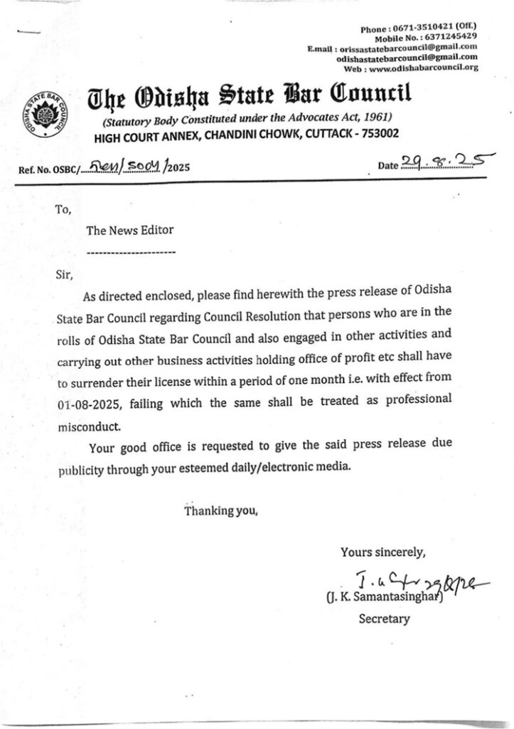 କାଉନ୍ସିଲ୍ର ନିଷ୍ପତ୍ତି ଅନୁଯାୟୀ, କାଉନସିଲର ସଦସ୍ୟତା ରଖୁଥିବା ଯେଉଁ ଓକିଲମାନେ କୌଣସି ଲାଭଜନକ ପଦବୀ, ଅନ୍ୟାନ୍ୟ କାର୍ଯ୍ୟକଳାପ କିମ୍ବା ବ୍ୟବସାୟିକ କାର୍ଯ୍ୟରେ ନିୟୋଜିତ ଅଛନ୍ତି, ସେମାନଙ୍କୁ ୧ ଅଗଷ୍ଟରୁ ଆରମ୍ଭ ହୋଇଥିବା ଏକ ମାସର ମଧ୍ୟରେ (ସେପ୍ଟେମ୍ବର ମାସ ପର୍ଯ୍ୟନ୍ତ) ନିଜ ନିଜ ଓକିଲାତି ଲାଇସେନ୍ସ ସରେଣ୍ଡର କରିବାକୁ ପଡିବ। ନଚେତ୍ ଏହାକୁ ପେଶାଗତ ଅସଦାଚରଣ ବୋଲି ବିବେଚନା କରାଯିବ।