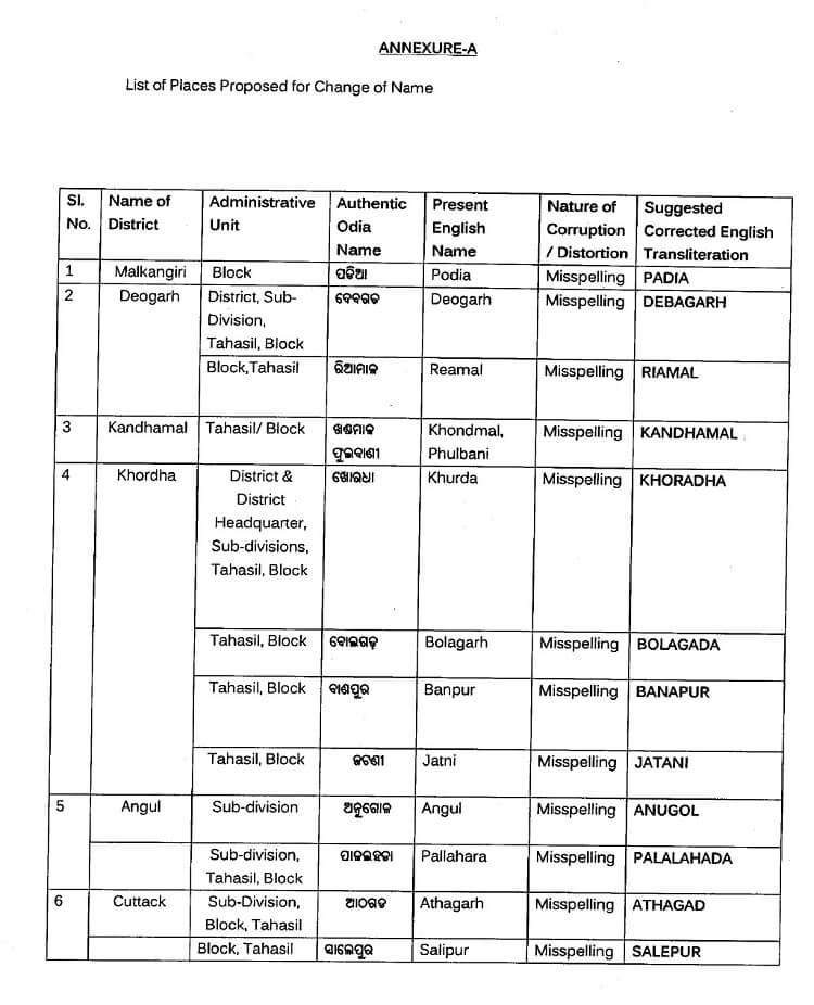 ୧୧ ଜିଲ୍ଲାର ୨୪ଟି ସ୍ଥାନର ଇଂରାଜୀ ବନାନ ସଂଶୋଧନ ପାଇଁ ରାଜ୍ୟ ସରକାରଙ୍କ ପଦକ୍ଷେପ